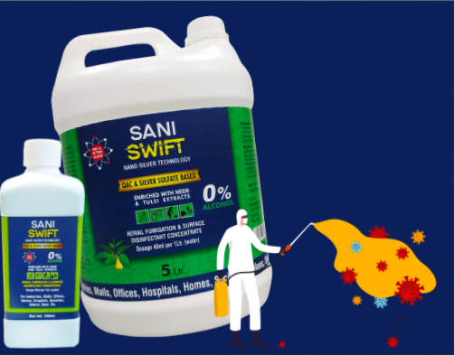 SANI SWIFT DISINFECTANT was made with a purpose to not be only useful but also to be harmless to people. It is India’s first triple action disinfectant made with QAC (Quaternary Ammonium Compounds), Silver Nano Particles & Surfactant with Neem & Tulsi extracts.